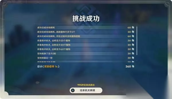 若本局挑战中,逃脱的魔物总数没有超过指定条件,则挑战成功。当逃脱的魔物总数超过指定条件后,挑战失败,棋局会立刻结束。 挑战结束后,旅行者们可以按照棋局的结算规则获得相应数量的「奇术符」。「奇术符」可用于解锁和升级奇术机关。