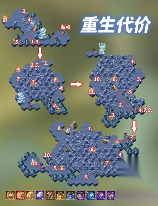 剑与远征重生代价攻略是什么?想必各位小伙伴一定非常困惑吧,小编得知之后也是连夜整理出来了最新的攻略指南,希望能够帮助到各位,剑与远征是一款非常有趣的冒险类型游戏,玩家在其中需要不断地通过自己的操作和努力击败更多的boss获取更多的奖励同时提升自己的战斗力,接下来去看看小编整理的攻略吧。 剑与远征重生代价攻略路线图 1、移至点1,触发机关以改变防护屏障的位置。 2、触发点2机关,让旋风移动至此点。 3、来到点3,再次操作机关,令防护罩转移。 4、直接抵达点4,领取此处的奖赏。 5、前往点5,清除沿途的敌人集团并赢取奖励。 6、进入点6处的传送门。 7、在点7操控机关,使得旋风移动到该点。 8、到达点8,触动机关以转移防护罩覆盖范围。 9、直接来到点9,收获此处的奖励资源。 10、在点10操作机关,让旋风迁移至此点。 11、到达点11并触动机关,更改防护罩位置。 12、直接在点12处获取预设的奖励。 13、控制点13的机关,令旋风移动至指定位置。 14、抵达点14,击败沿路的敌军集群并获取奖励。 15、通过点15的传送门进入下一区域。 16、在点16处指挥旋风转移到该点。 17、继续在点17操作,使旋风移动至相应位置。 18、来到点18,扫荡沿途的敌人阵线,接触机关以转移防护罩。 19、直接领取点19的奖励物资。 20、控制点20的机关,调动旋风移到该处。