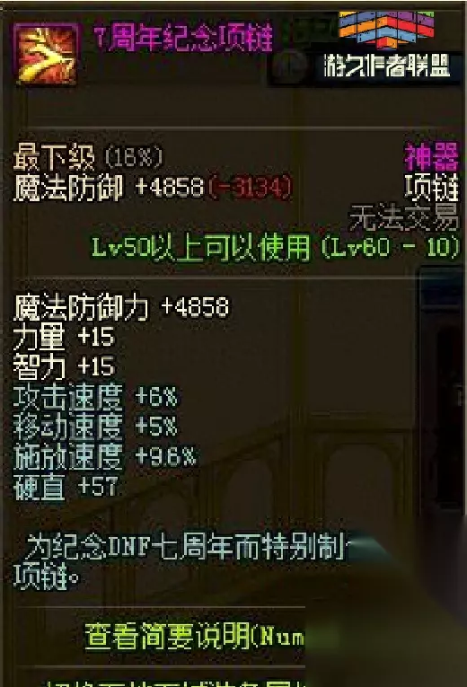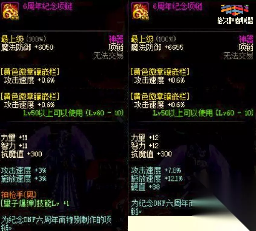 很多玩家错过了五周年的金手镯都非常的后悔,那么六周年的时候可以说是第一次开放周年纪念首饰套装的了,其中手镯跟戒指跟五周年一样,分为青铜,白银和黄金三个版本,每个版本对应一个相应的等级:10级、40级、60级。 手镯跟五周年的属性一样增加物理和魔法伤害,最高依旧是9%;戒指属性是增加魔法暴击率和物理暴击率,最高6%。 六周年纪念装备中,项链是一大亮点,很多人有了手镯戒指但是没有项链,主要是项链的获取方法是6月21日的整点在线中获取。为什么说项链是亮点呢,因为增加攻击速度和施放速度,当进入决斗场后的攻击速度高达7.8%的,这属性我现在用9周年的项链进去都达不到。 同时六周年的套装属性是增加30点的体力和精神以及2%的攻速和施放、5%的移动速度,也是第一套装出现的周年首饰。 七周年