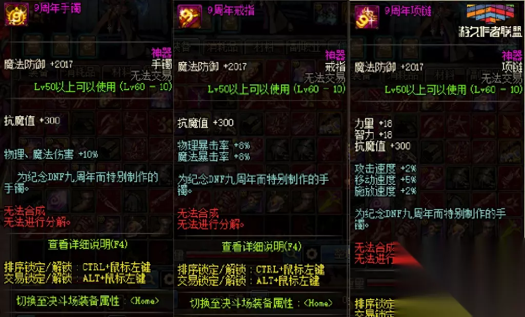 八周年和九周年的的周年纪念首饰属性是一样的: 手镯的物理魔法伤害提升10%,比往年的伤害提升了一些;戒指双暴提升到了8%,比往年提升了2%;项链,基础属性提升,三速与往年一致。 套装属性均为40点的体力和精神以及三速的提升。总体来说对小号的提升搬砖非常的实用。圣物套搭配这三件还是很舒服的。 十周年