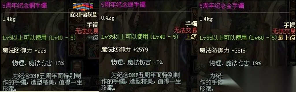 五周年的首饰是纪念手镯,分为三个级别的:铜手镯增加3%的物理/魔法伤害;银手镯增加5%的物理/魔法伤害;金手镯提升9%的物理/魔法伤害。 在那个时候,这个金手镯的属性可以说非常的强,并且与当时最强的史诗无影剑,魂链等都是不会冲突的,这个伤害是黄字伤害,所以与其他黄字伤害的装备是冲突了。 虽然这个手镯在当时周年庆被大家苦苦追求,但是获取的方法是比较难的,燃放五周年的爆竹后随机获得,所以当时不知道大家有没有看到满城都是燃放爆竹的勇士? 六周年首饰