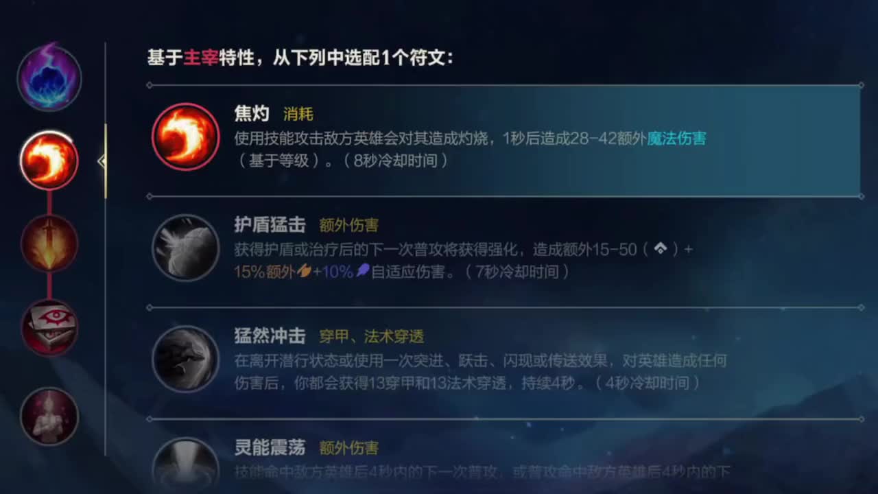 4、黑暗收割 伤害一名生命值低于50%的英雄时会造成自适应伤害并收割该英雄的灵魂,将黑暗收割的伤害永久提升5。 黑暗收割伤害:20-80(基于等级)(+5伤害x灵魂数)(+0.1额外攻击力)(+0.05法术强度)。 冷却时间:45和(参与击杀尉重置到1.5秘)。 5、恶意中伤 对移动或行动受损的敌人造成10~45额外真实伤害(基于等级)。 冷却时间:4秒,会在移动受损之后触发伤害。 6、气定神闲 对一名敌方英雄造成伤害时,会使法力回复每秒提升(远程英雄为80%),持续4秒,作为替代,所有使用能量的英雄会每秒回复1.5能量。 参与击杀后会回复你15%的最大法力值或最大能量值。