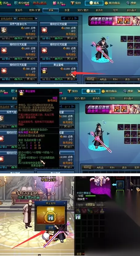 方法二:商城购买道具 1、进入商城,选择道具页面,点击装备栏。 2、在装备中找到黄金蜜蜡,购买黄金蜜蜡后返回主界面。 3、点击背包装备,选择想要封装的宠物装备即可。