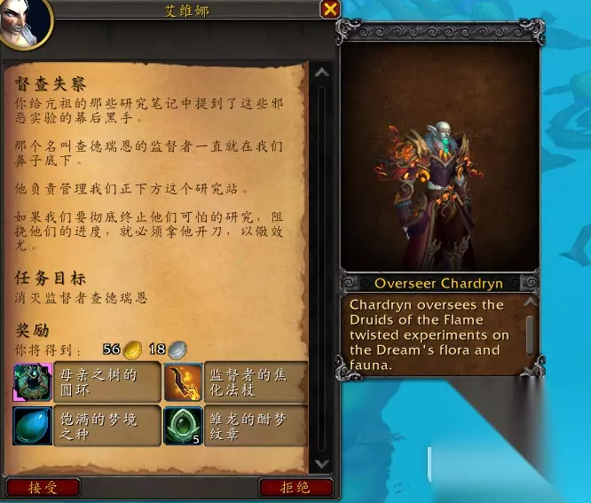 最终奖励:母亲之树的圆环(披风幻化)、奸诈者的研究笔记(250梦境守望者声望)、监督者的焦化法杖(750梦境守望者声望)、饱满的梦境之种、5个雏龙的酣梦纹章