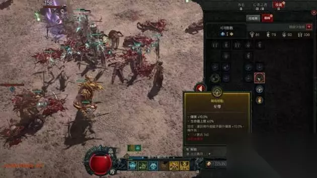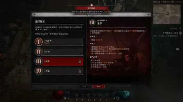 注意到中间的红色区块吗?那就是镶嵌雕纹后带来的范围提升,可惜雕纹格的数量并不多 晋阶地城与难度 在先前的测试中,可以了解到《暗黑破坏神4》有5个难度,而在通关第一次主线前,玩家只被允许开启「普通」和「精锐」两个难度,那么要如何开启之后的难度呢?方法并不难,就是通过一个名为晋阶地城的考验。这个地城的长度会比普通的地城来得略长,难度也会稍高,不过只要通过这个地城,你就能在难度选择部分前往下一阶段的「恶梦」。至于「苦痛」和最高难度想必也是如此处理,每一个难度间的难度曲线比以往明显陡峭不少,可以说只略低于《暗黑破坏神3》初期、刚踏入苦痛的难度差。 以笔者这次练的死灵法师为例子,在初入恶梦时,面对菁英怪的围攻,作为主要坦克角色的魔像,也顶多只比《暗黑破坏神3》初期的巨尸多活个10秒就极限了,普通的骷髅更是2~3击就会被打碎。所以如果想要一开服直接冲破主线到恶梦难度,那对自己的操作和配装最好有一定的自信。