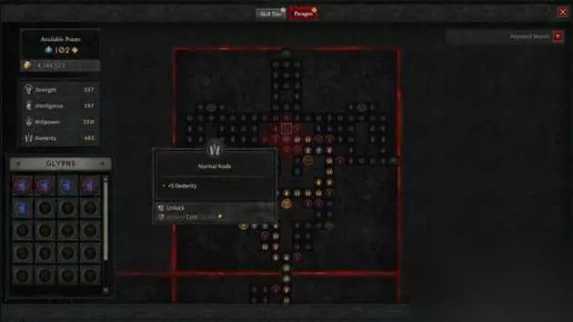 凑满10点回去低语之树处就能交换奖励,但无法累积大量一口气兑换 按照笔者的经验,如果不前往耗时较久的地城,那平均约10~15分钟就能交换一次奖励。不过要注意这个禁邪恩惠并不能无限叠加,且超过10点后也无法继续完成任务,所以与随机事件赠送的低语古币不同,无法一次累积大量点数后才去交换,相对之下可能会比较不方便。 巅峰等级与雕纹 而第二个会碰到的终局游戏要素,就是老玩家都很熟悉的巅峰等级。巅峰等级是在玩家角色超过50级之后会开启的新系统,此时提升经验值不再给予技能点,而是给予巅峰点数,让玩家能够进一步强化角色的素质。不过与《暗黑破坏神3》略有不同,本次是以星盘的方式显示,玩家必须逐格往上升级。除了力量、敏捷、智力、意志等基础素质的提升外,每隔一段距离还会更高阶的巅峰格可以升级,往往会提供不小的加成,比起三代那塞牙缝的巅峰来得有感许多。 而这次的巅峰等级不只是给玩家加基础素质,还有一个类似《流亡黯道PoE》宝石的「雕纹」系统。在巅峰画面中,玩家可以在空的雕文格内镶嵌一个雕纹,雕纹的种类相当多样,提供的加成也各有不同,且这些强化还会同时对周边的巅峰格造成影响。可惜的是这个雕纹格在整个画面的数量非常少,没办法频繁透过雕纹带来飞跃性的提升。