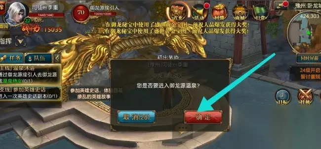 3、然后会出现一个是否进入御龙源温泉的窗口,点击确定;