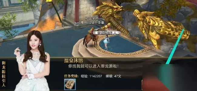 泡温泉加经验攻略: 1、在卧龙城找到NPC御龙源接引人去做寻访御龙源的任务;