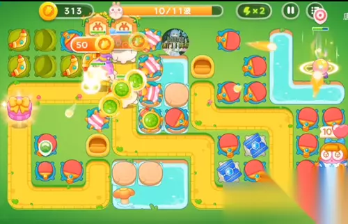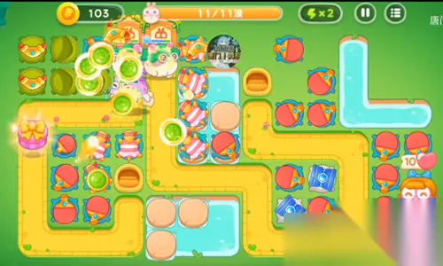 4、这一波是红色的塔炮来攻击右边的草,左边就直接攻击兔子。