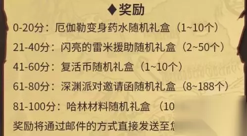 活动时间:2019年2月1日-2月20日 活动地址 活动规则 点击开始即可开始游戏,途中每位NPC都会出一道题考验勇士,五道题过后根据得分可以获得赛丽亚送出的不同奖励。 每天都可以来领取一次奖励哦 活动奖励 0-20分:厄伽勒变身药水随机礼盒 21-40分:闪亮的雷米援助随机礼盒 41-60分:哈林材料随机礼盒 61-80分:复活币随机礼盒 81-100分:深渊派对邀请函随机礼盒 奖励将通过邮件的方式直接发送至您的邮箱