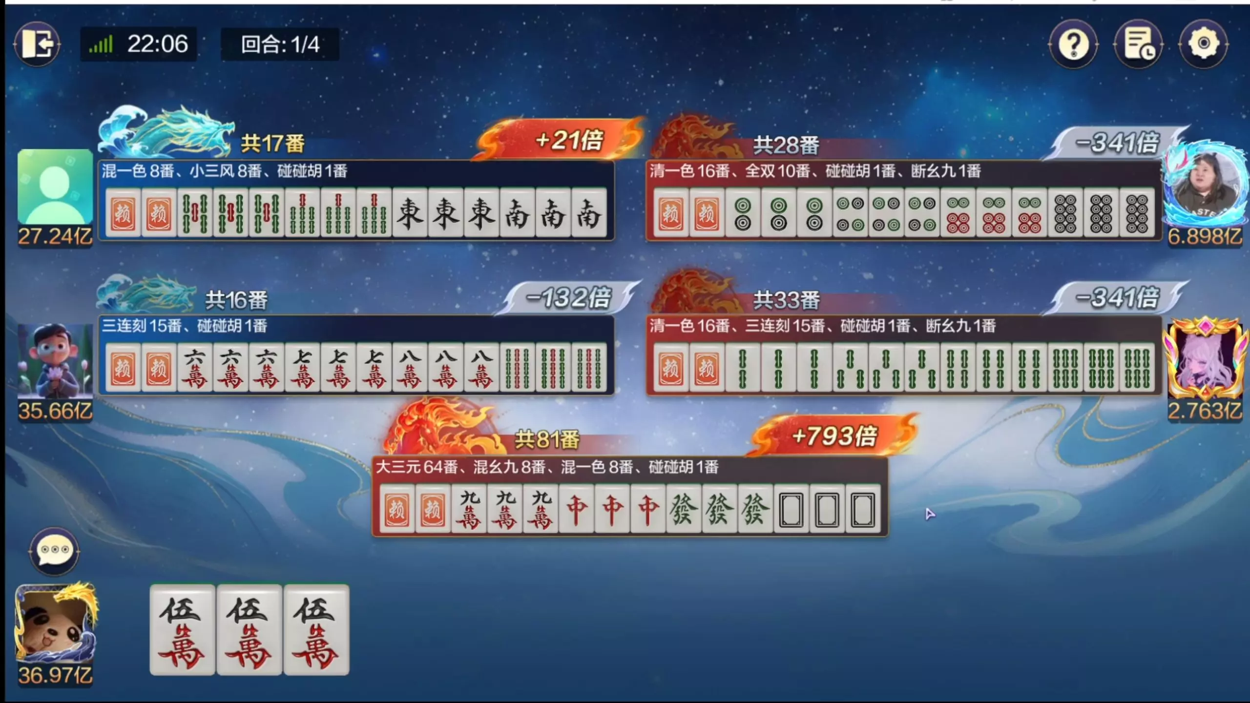 这是腾讯欢乐麻将百变大三元牌型对局,玩家起手牌型极佳,凑出多张红中与发财,在对局中逐步杠牌凑牌,最终成功胡出大牌大三元,收获超高倍数。