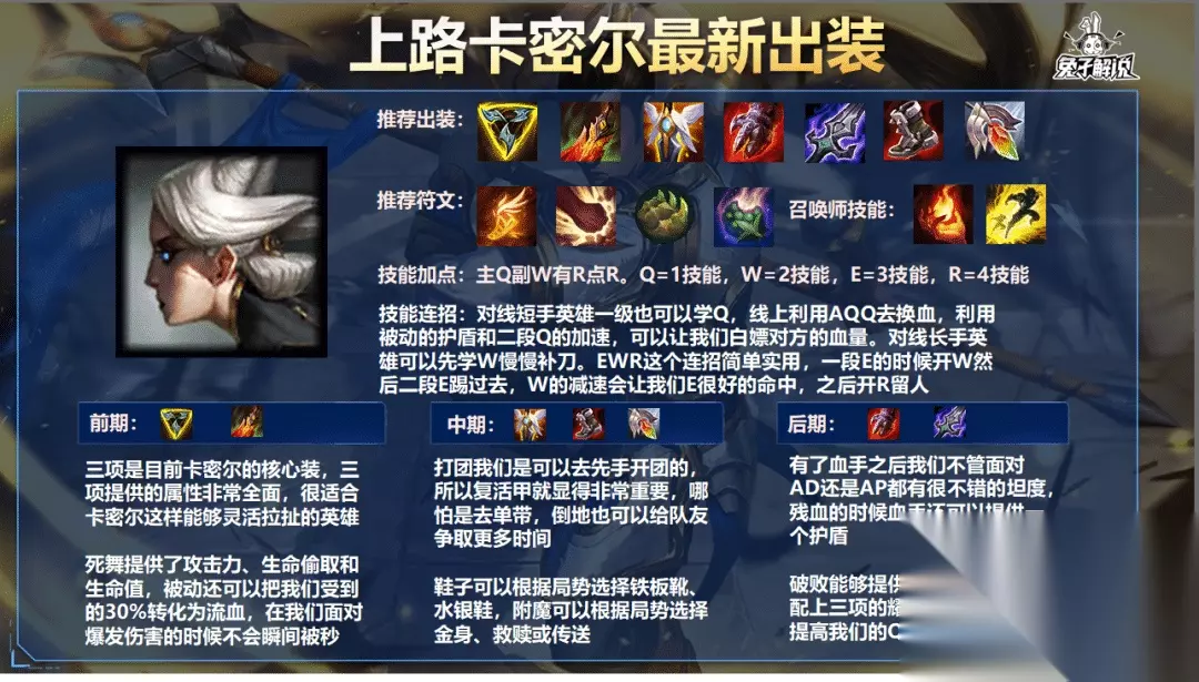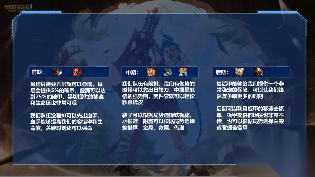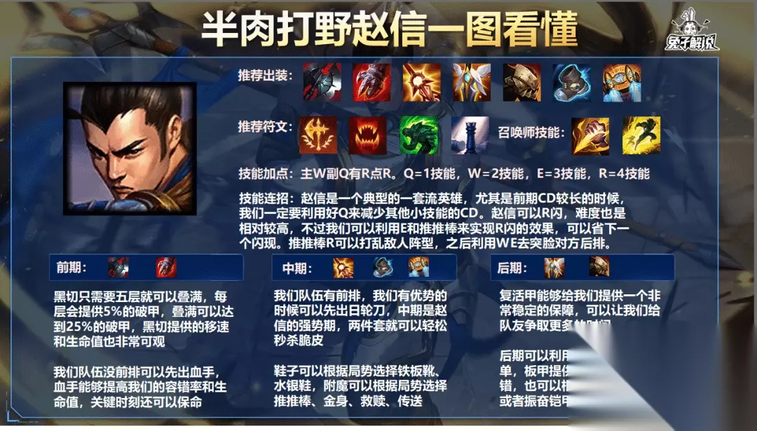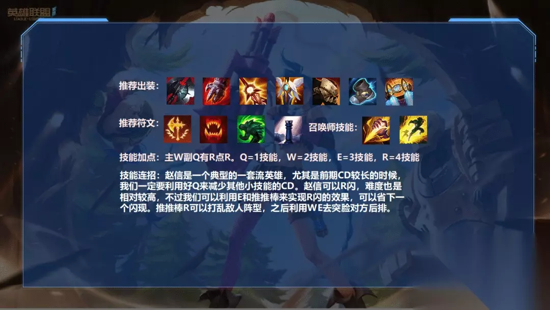 出装方面: 我们之一件就固定黑切,像幽梦什么的我是不建议大家出的,不仅收益低,还影响我们装备的成型速度,赵信本身的伤害就不错,不需要太多的输出装,那么我们出了黑切会缺乏攻速,这就要说到日轮刀了,日轮刀能够提高我们的攻速,并且释放技能后还会提高我们下一次的普攻,非常适合赵信这种技能穿插平A的英雄来用,如果我们队伍没前排,我们第二件还是要做血手,不然会很脆,打团根本站不住的,血手的被动在残血时会根据我们更大生命值来提供给护盾,能够帮我们分摊大部分的伤害,给予我们更高的容错率。复活甲也非常重要,这个在我们打团的时候可以提供一个非常稳定的保障,不会让我们没打出伤害就暴毙。最后一件可以出板甲,也可以出兰顿来针对敌方暴击伤害或者出振奋铠甲应对法伤。鞋子可以选择铁板靴或者水银鞋,一般我都是选择水银鞋,赵信是比较怕控制的,附魔可以选择推推棒或者金身,救赎也可以用。 推荐天赋: 征服者能够大幅提高我们的持续作战能力 猎人吸血搭配我们被动有一个很强的续航 适应性外壳可以提高我们的容错率 战略家能够提高我们的推塔和打龙/峡谷的速度 技能连招: 赵信是一个典型的一套流英雄,尤其是前期CD较长的时候,我们一定要利用好Q来减少其他小技能的CD。赵信可以R闪,难度也是相对较高,不过我们可以利用E和推推棒来实现R闪的效果,可以省下一个闪现。推推棒R可以打乱敌人阵型,之后利用WE去突脸对方后排。 对局详解