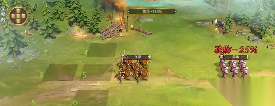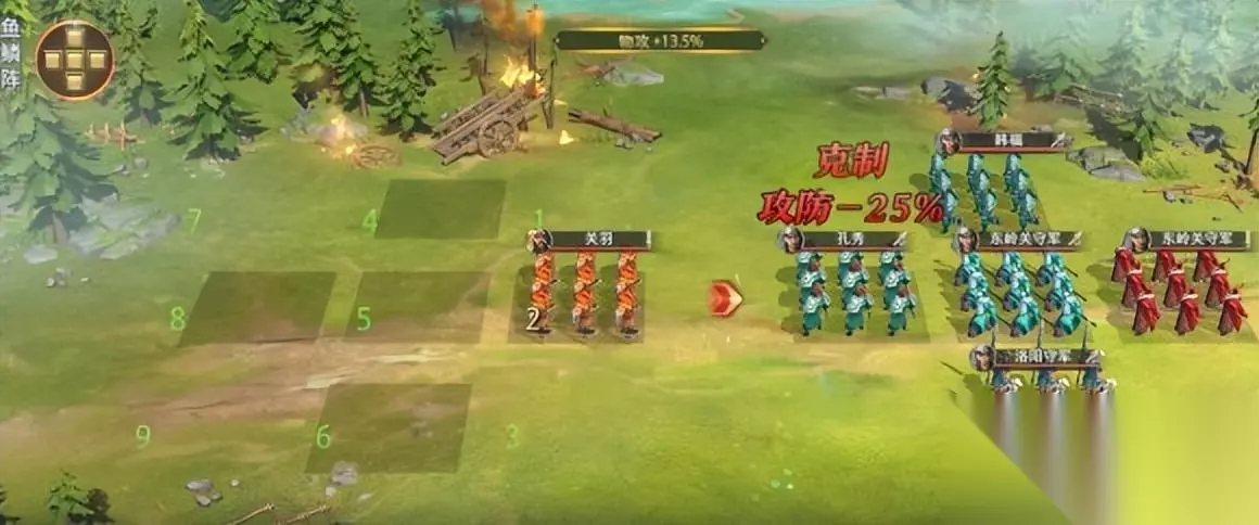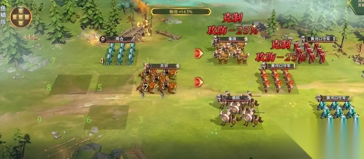 千里独行-4 需要注意的要点:选择手臂和对位 操作方法:与上官相反,改变关羽和周仓的位置。关羽选骑推兵在中,周仓选枪兵推兵在上。