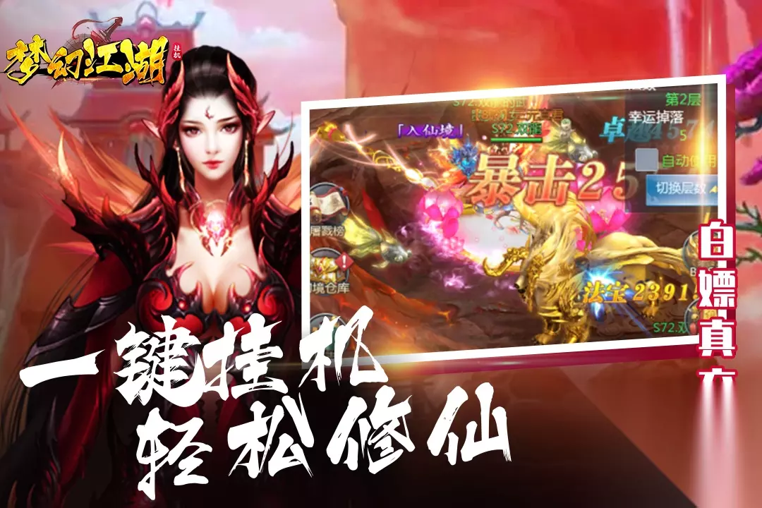 期待已久的手游梦幻江湖即将登陆233乐园,这款手机游戏吸引了大批玩家的关注,有很多粉丝都在问233乐园小编梦幻江湖好玩吗?梦幻江湖值不值得玩?现在就为大家来简单分析下,看看这款游戏的玩法特点和游戏剧情介绍。 1、梦幻江湖简要评析: 休闲娱乐挂个机,万元真充送不停,这里的极品神兵、海量元宝、绝版仙翼奢华时装统统免费领,升级还送VIP,!震撼高福利让平民玩家从此翻身做大佬,让你在单人竞技、多元PK、跨服对决、挑战BOSS、奇遇副本等超多玩法中释放激情。 2、梦幻江湖图片欣赏: