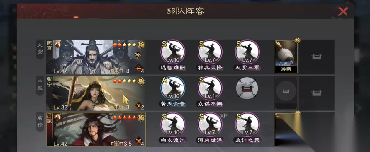 三、黄天余音·属性操控的掠夺者 张宁手持"黄天余音",上演属性乾坤大挪移! 必中法则:100%发动率的主动战法!每回合稳定触发,绝无哑火! 属性虹吸术:强夺敌军单体武将武力、智力、速度、防御各26点(合计104点属性)!此消彼长,瞬息改写战力天平! 双重恩泽:窃取之力并非独享!自身与另一名友军将平分这份"厚礼",持续整整一回合! 站位要诀(致命细节!):战法距离仅为4!若置张宁于大营,利爪难以触及敌军大营主将!中军位置方能确保属性掠夺覆盖敌军全军要员! 四、天公之女·辅攻一体的暗影大师 张宁的价值远超表面所见: 属性博弈论:虽仅压制目标一回合输出,但我方双将获得全属性飙升!此长彼消之间,净收益碾压单纯减伤!以属性差制造局部碾压! 隐藏的杀机:顶级谋略成长使其完全胜任输出位!携带"十面埋伏"、"楚歌四起"等谋略战法时,吸属性后的张宁自身即是恐怖炮台! 致命天敌与对策:主动战法最大的梦魇——控制!"混乱"、"犹豫"状态可打断施法。始计(洞察状态)乃其最佳拍档!首回合免疫控制,确保属性掠夺顺利启动,奠定胜局! 实战连携精要: 步诸葛体系:前锋肉盾(如赵云、夏侯惇)+ 中军步诸葛(锦表/输出/治疗)+ 大营爆发输出(如关银屏、荀彧)。诸葛坐镇中军,锦表稳定覆盖三将! 张宁刺客流:前锋控制(如曹仁、孙策)+ 中军张宁(黄天/始计/输出)+ 大营单点爆破(如张辽、王异)。张宁中军位确保属性窃取覆盖敌军大营,配合始计无惧控制! 双辅联动(豪华配置):前锋步诸葛(减伤/增伤) + 中军张宁(属性收割) + 大营超核输出(如吕布、马超)。双光环加持下,核心输出将毁天灭地! 步诸葛亮以无死角的减伤增伤掌控攻防节奏,张宁则以诡谲的属性掠夺瓦解敌方根基。两者皆具化身为输出的潜力,但真正的价值在于——当他们屹立阵中时,全军将士皆能超越极限!精通这两位谋略宗师,你便掌握了战场天平倾斜的终极奥秘!