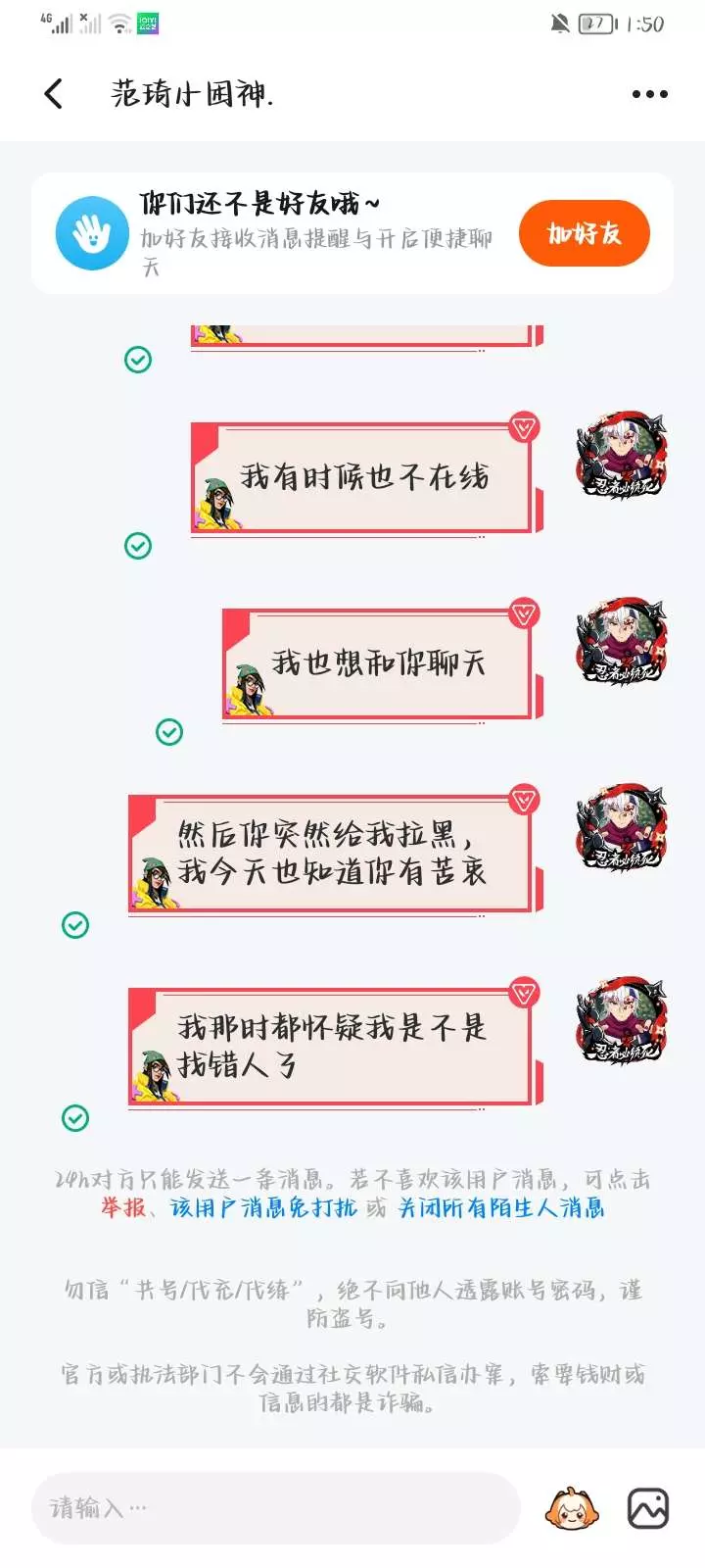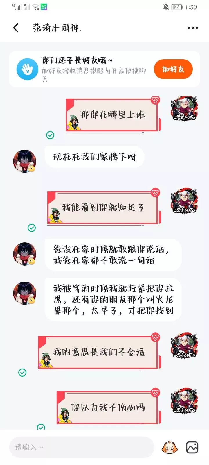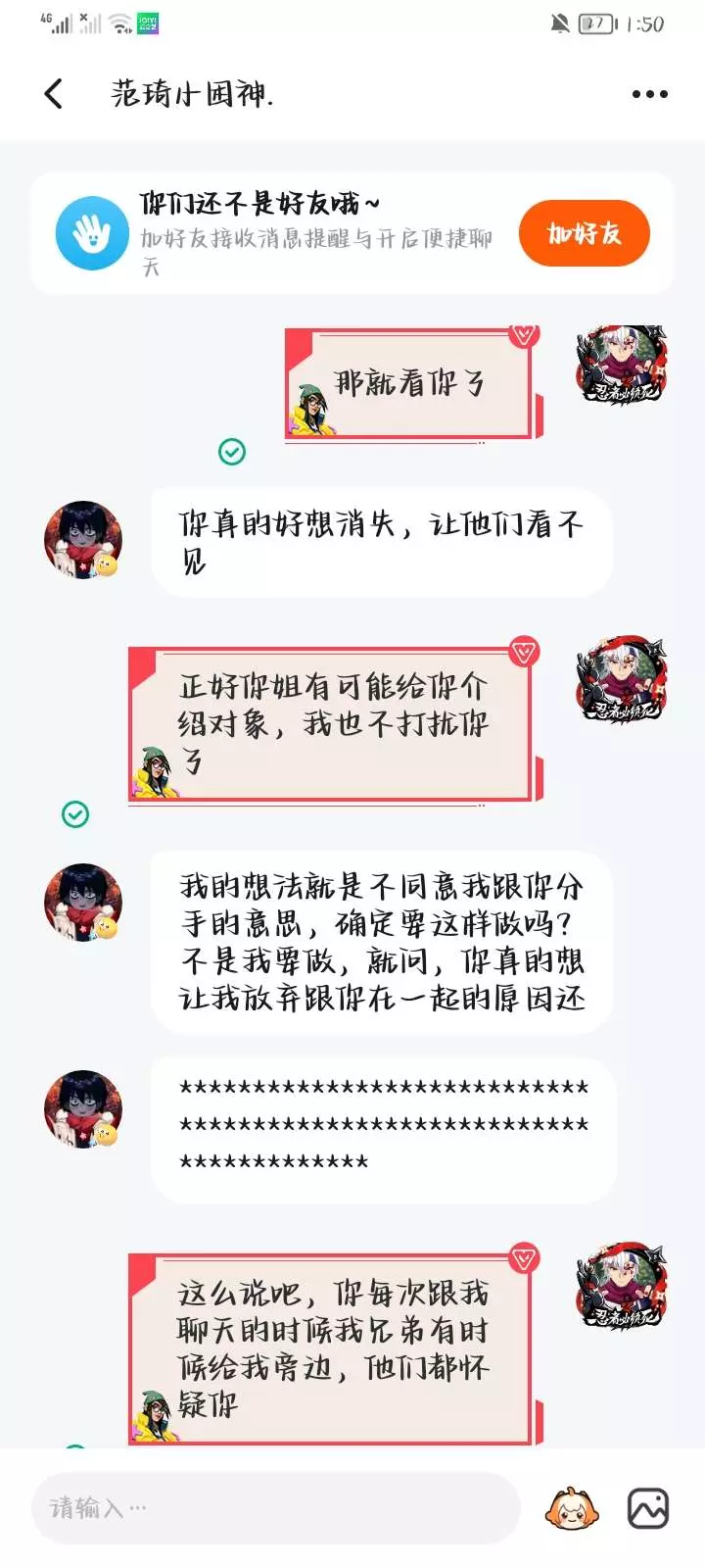 骗人很好玩吗?我看你的意思好像是让我主动找你复合,还有快手和233那个名字和简介都是什么意思?故意引起我的注意吗🙄还有你那233的头像咱就不说了昂。打字还能有错别字,我是真挺怀疑你的,这次我是真受不了!你骗过我几回了?一说要跟你见面,你就害怕了!咋的你自拍照是网图啊😒🙄成天重复加我好友,真不知道你要说什么🙄🤮(不是本人,请别骂这个号)我就在她面前看你们聊天,给我都看不下去了🙄🤮