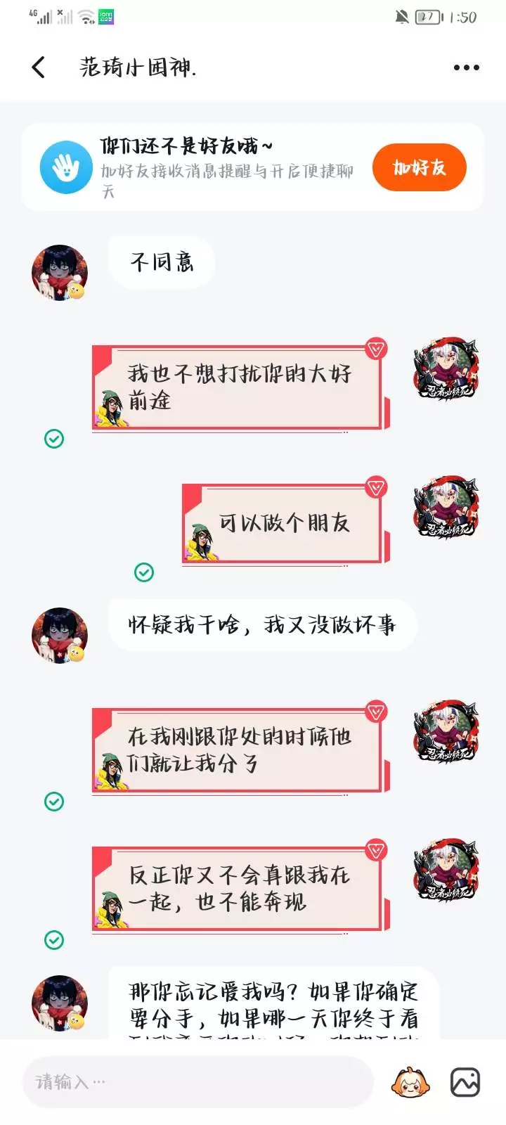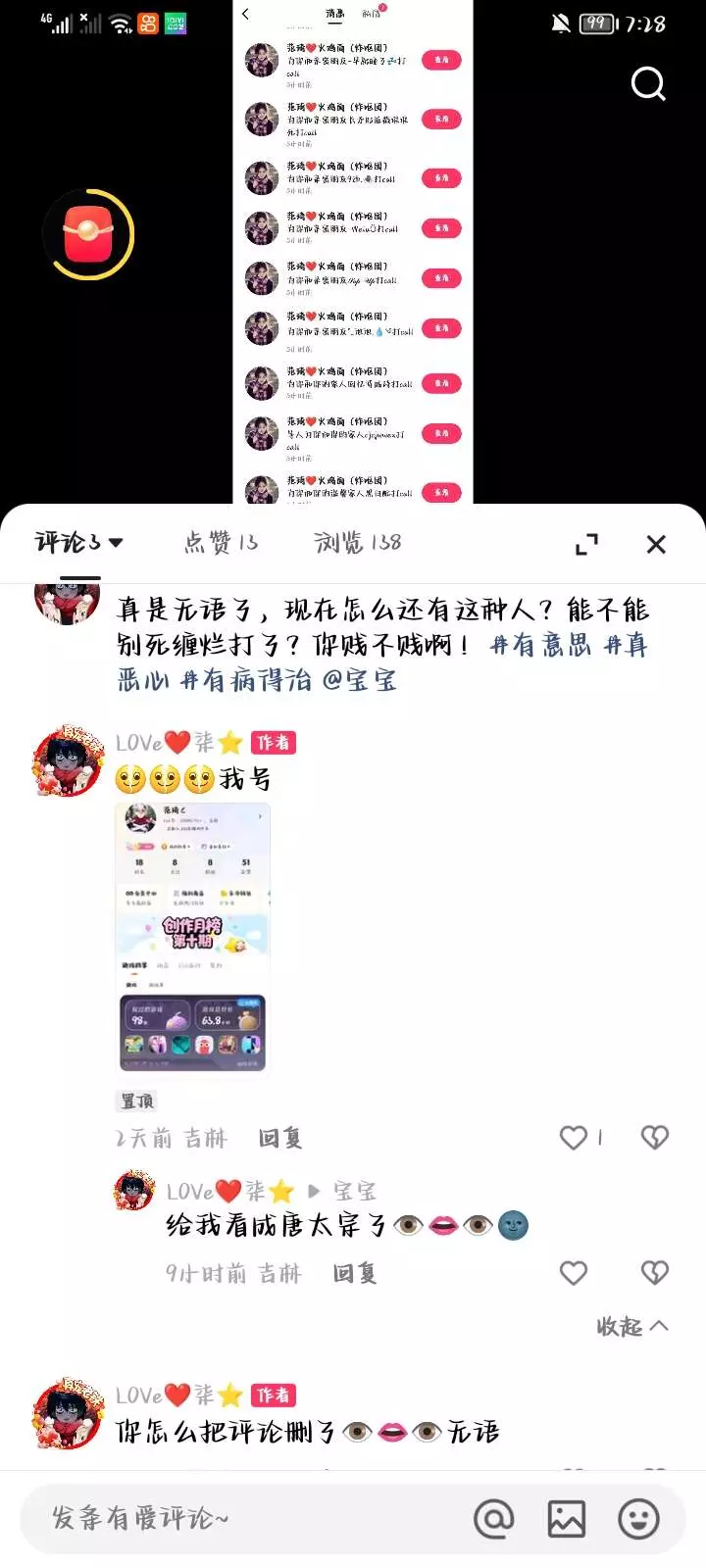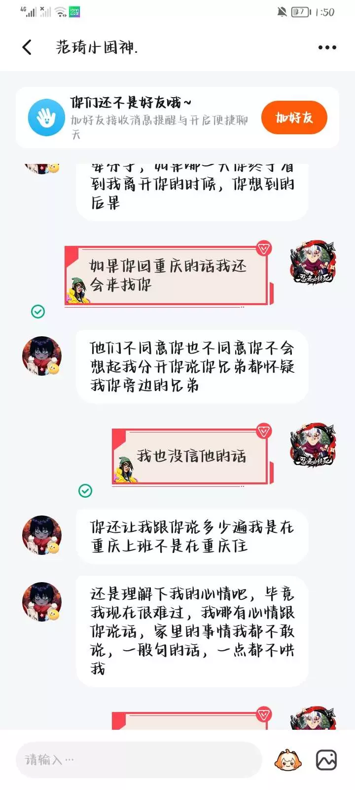 骗人很好玩吗?我看你的意思好像是让我主动找你复合,还有快手和233那个名字和简介都是什么意思?故意引起我的注意吗🙄还有你那233的头像咱就不说了昂。打字还能有错别字,我是真挺怀疑你的,这次我是真受不了!你骗过我几回了?一说要跟你见面,你就害怕了!咋的你自拍照是网图啊😒🙄成天重复加我好友,真不知道你要说什么🙄🤮(不是本人,请别骂这个号)我就在她面前看你们聊天,给我都看不下去了🙄🤮