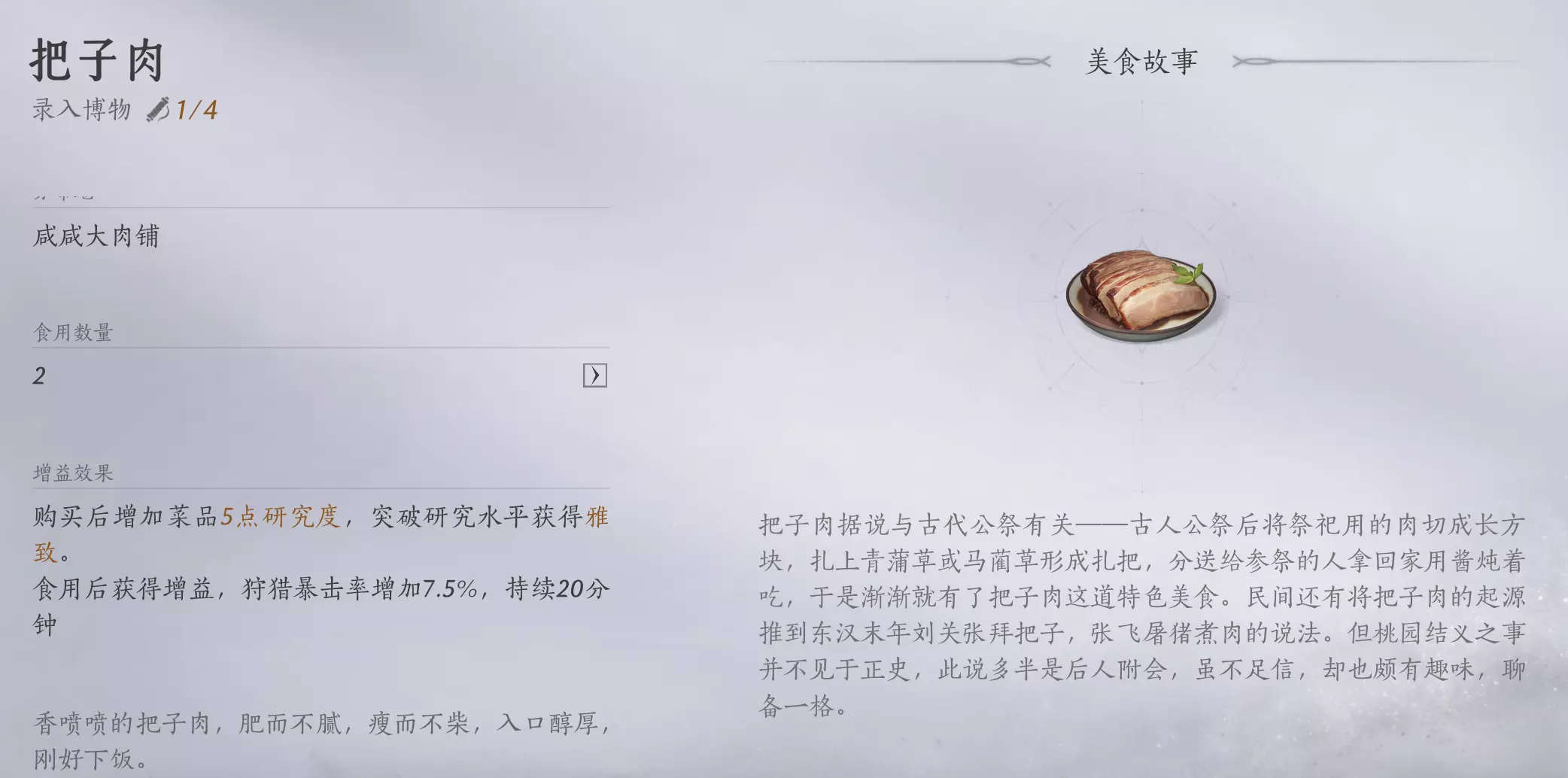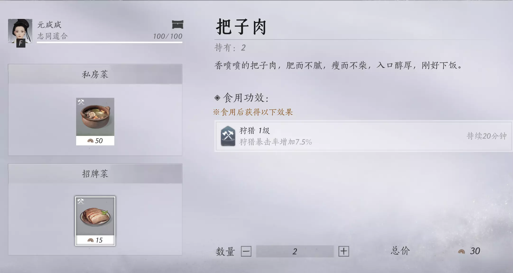 花费【 15 枚短陌钱 】就可以打包一份把子肉,在背包里【道具-消耗品】中打开食用,