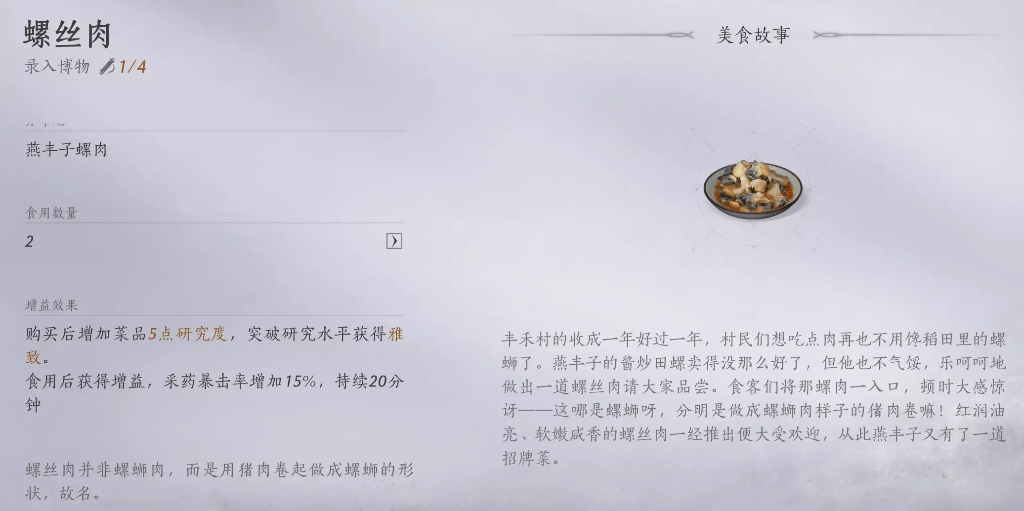 首次食用小吃后会获得(【博物点1】+【5长鸣玉】+【1点雅致】),食用四次后获得(【博物点1】+【5长鸣玉】+【1点雅致】)属性,食用累计八次后获得(【博物点2】+【10长鸣玉】+【1点雅致】。