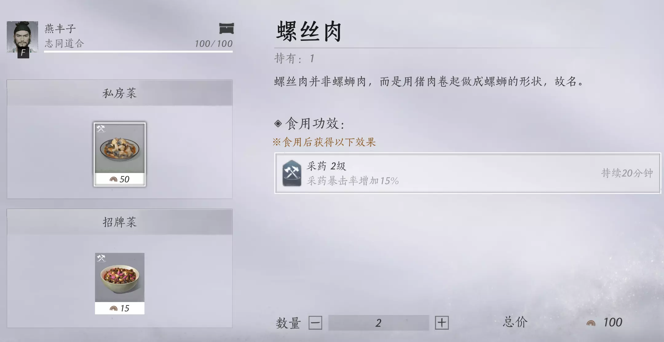 注意:每位摊主的招牌菜买到一定次数才可能解锁私房菜,大多数美食摊主NPC好感度满后会送2个心法心得·散本。