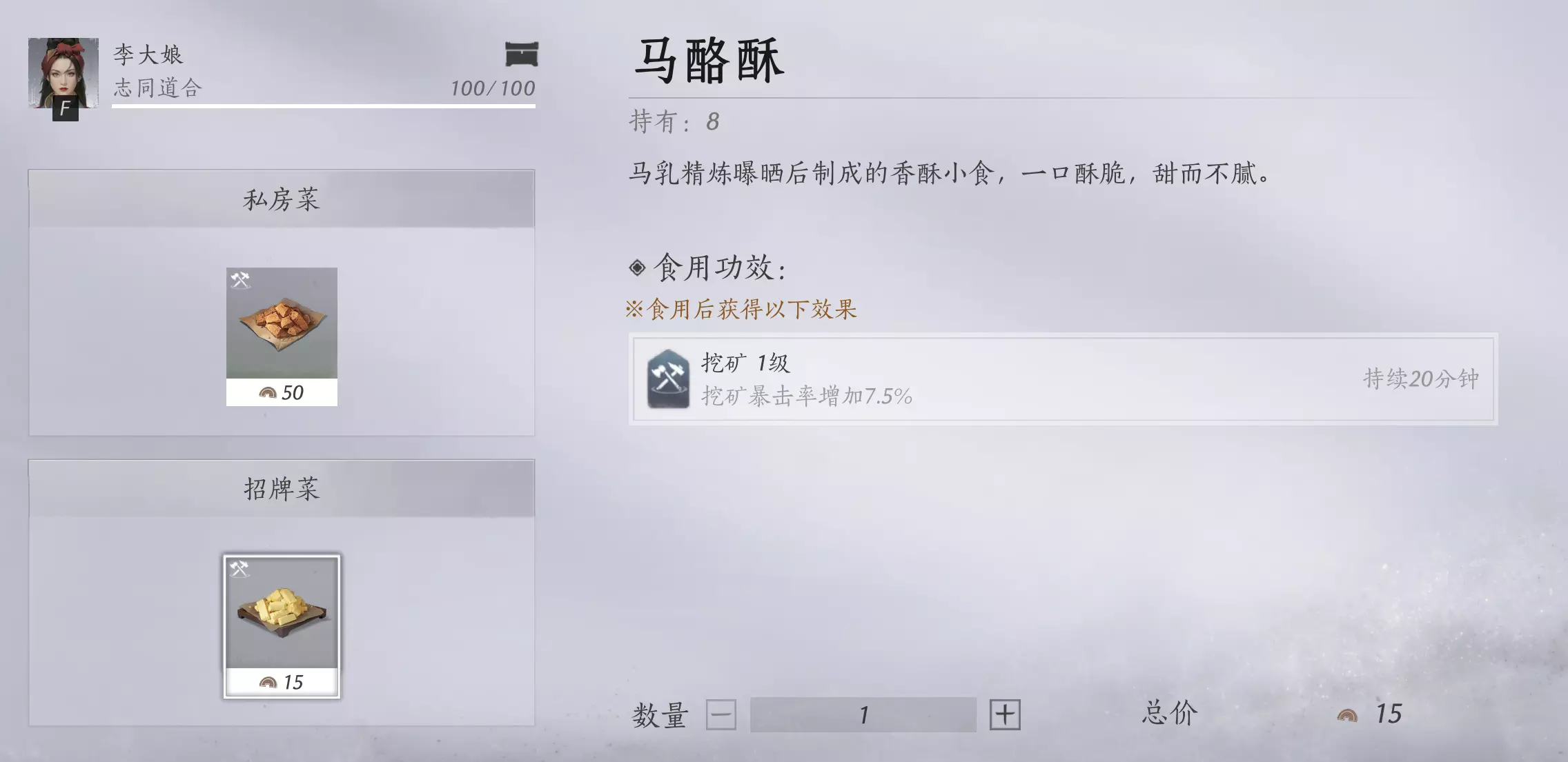 花费【 15 枚短陌钱 】就可以打包一份马酪酥,在背包里【道具-消耗品】中打开食用,