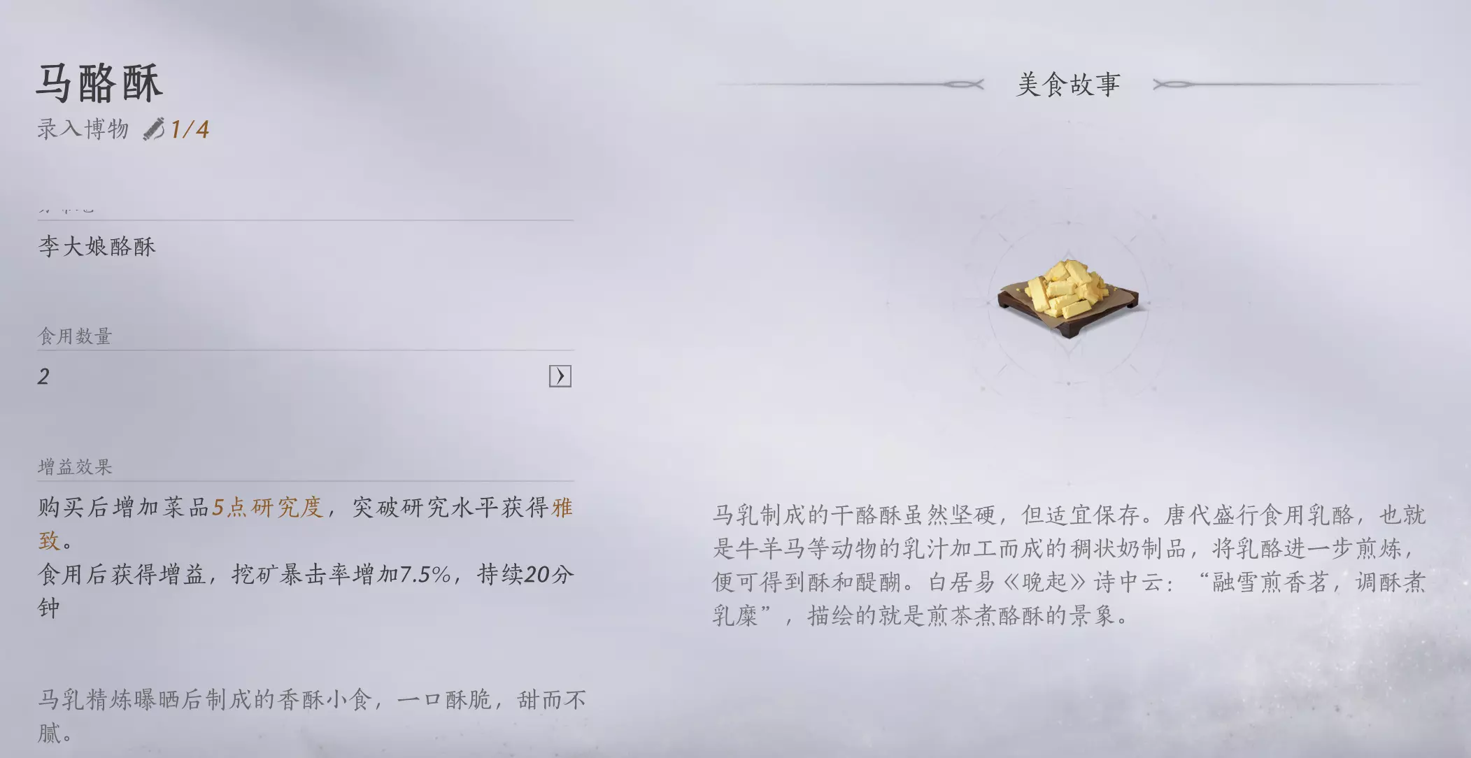 首次食用小吃后会获得(【博物点1】+【5长鸣玉】+【1点雅致】),食用四次后获得(【博物点1】+【5长鸣玉】+【1点雅致】)属性,食用累计八次后获得(【博物点2】+【10长鸣玉】+【1点雅致】。