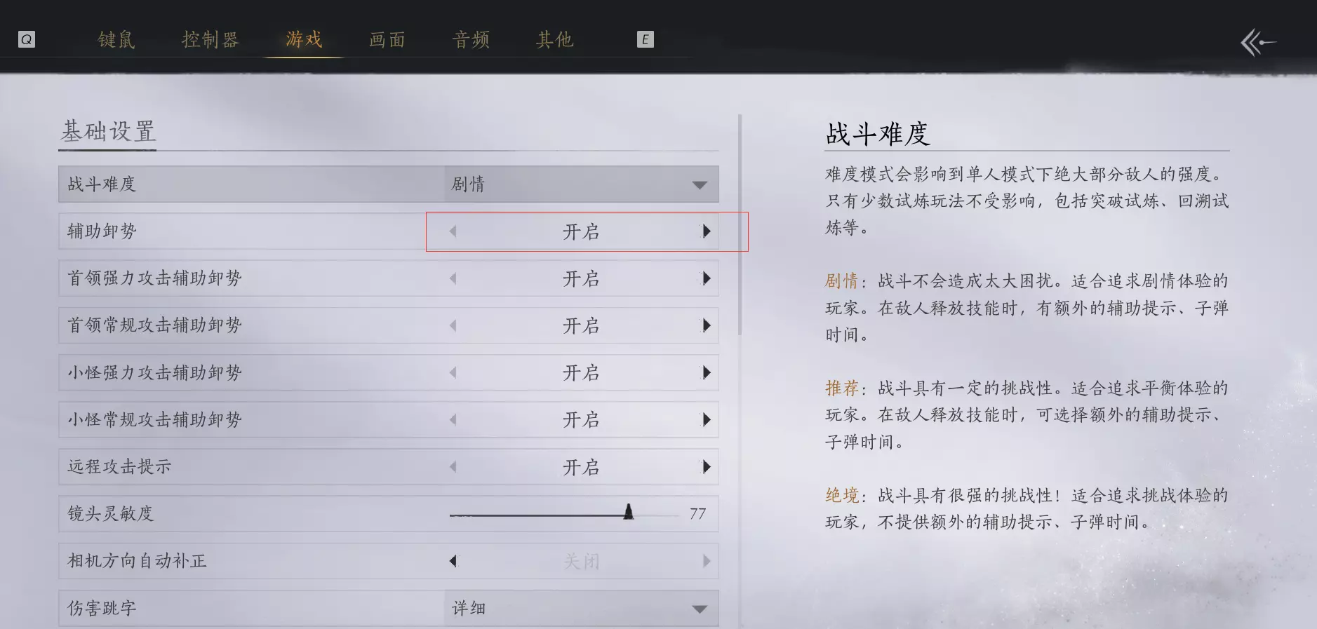 可以开启辅助卸势,敌人招式命中前的瞬间时间变慢同时提示卸势,成功卸势后会消耗洞识值。洞识值不足时则无法触发辅助卸势。