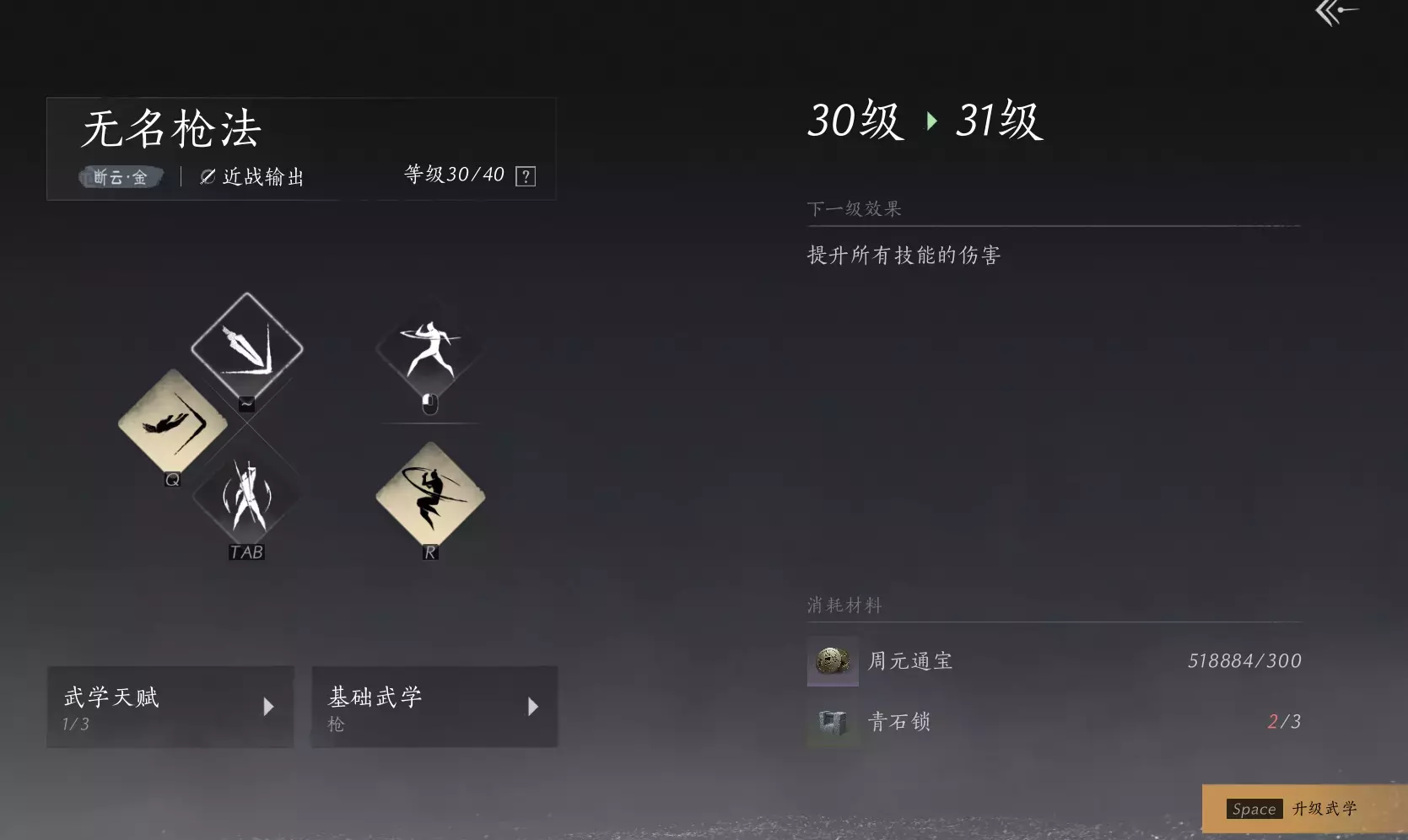 可以进行武学升级,可以显著提升武学的伤害,达到一定等级之后可以进行武学突破,解锁/升级武学天赋。