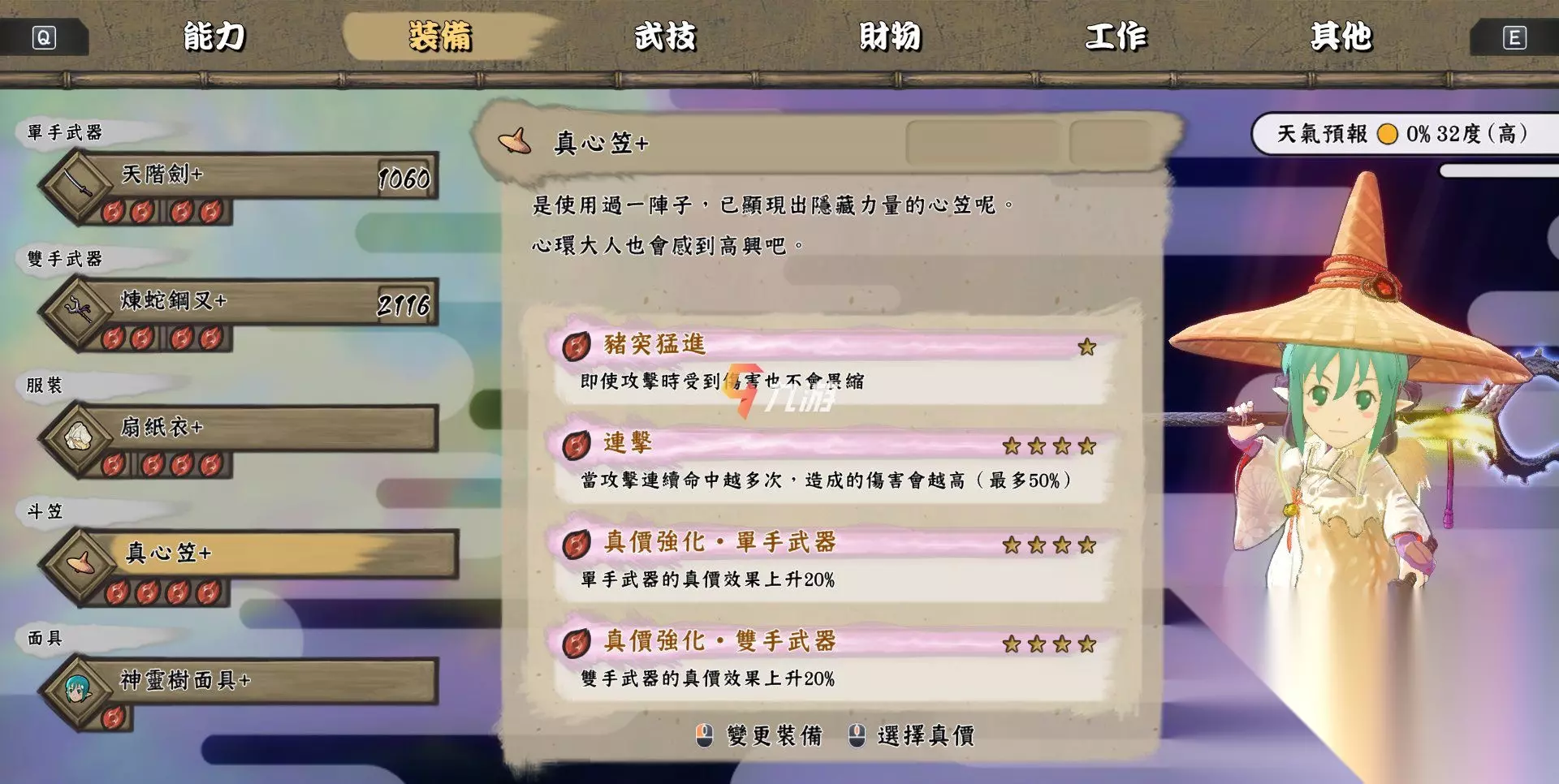 4、真心笠+ 【装备效果】即使被攻击也不退缩,如果攻击连续命中的次数越高,其伤害也就越高,最高可以提升一半的伤害;同时可以提升单手武器20%的真价效果、以及双手武器20%的真价效果; 【获取途径】获得心笠+之后可以去找结升级得到,而心笠+则可以通过天返宫270层boss掉落获得;