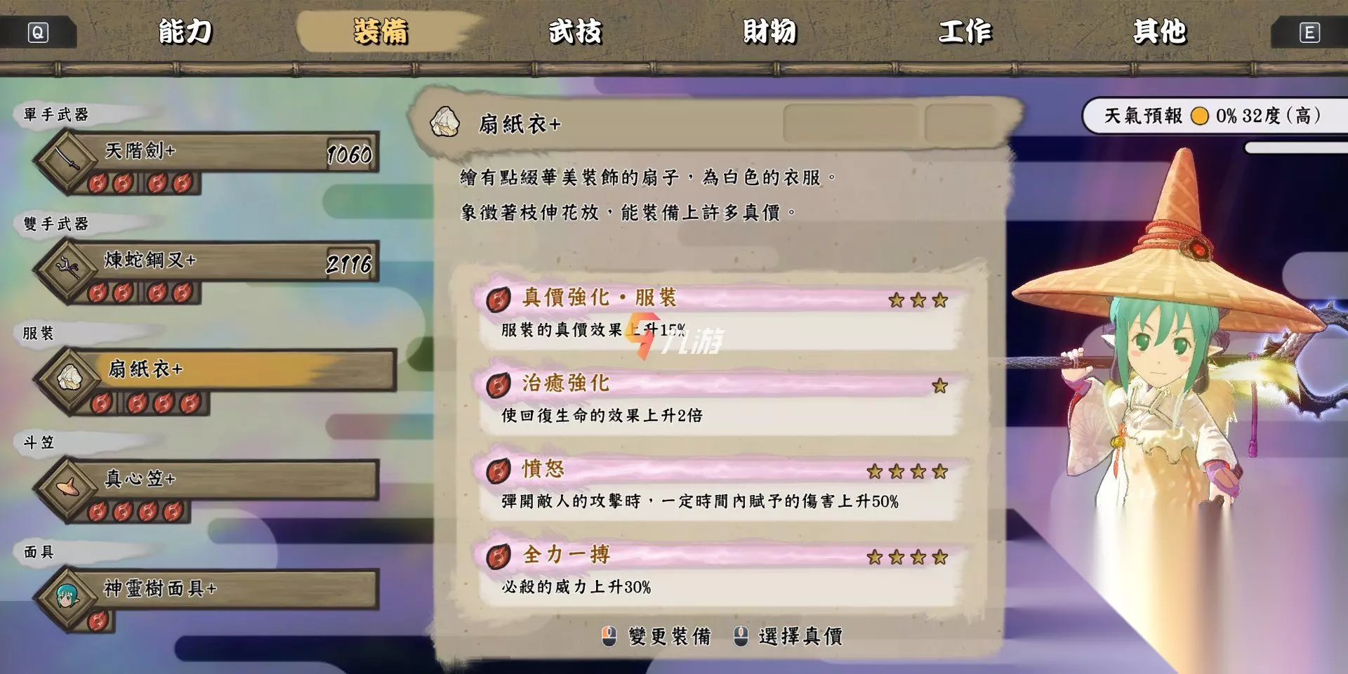 3、扇纸衣+ 【装备效果】可以提升服装15%的真价效果;提升两倍的生命恢复效果及30%的必杀伤害;同时反弹敌人攻击的话,在一定时间内可以提升一半的伤害; 【获取途径】天返宫210层boss掉落;