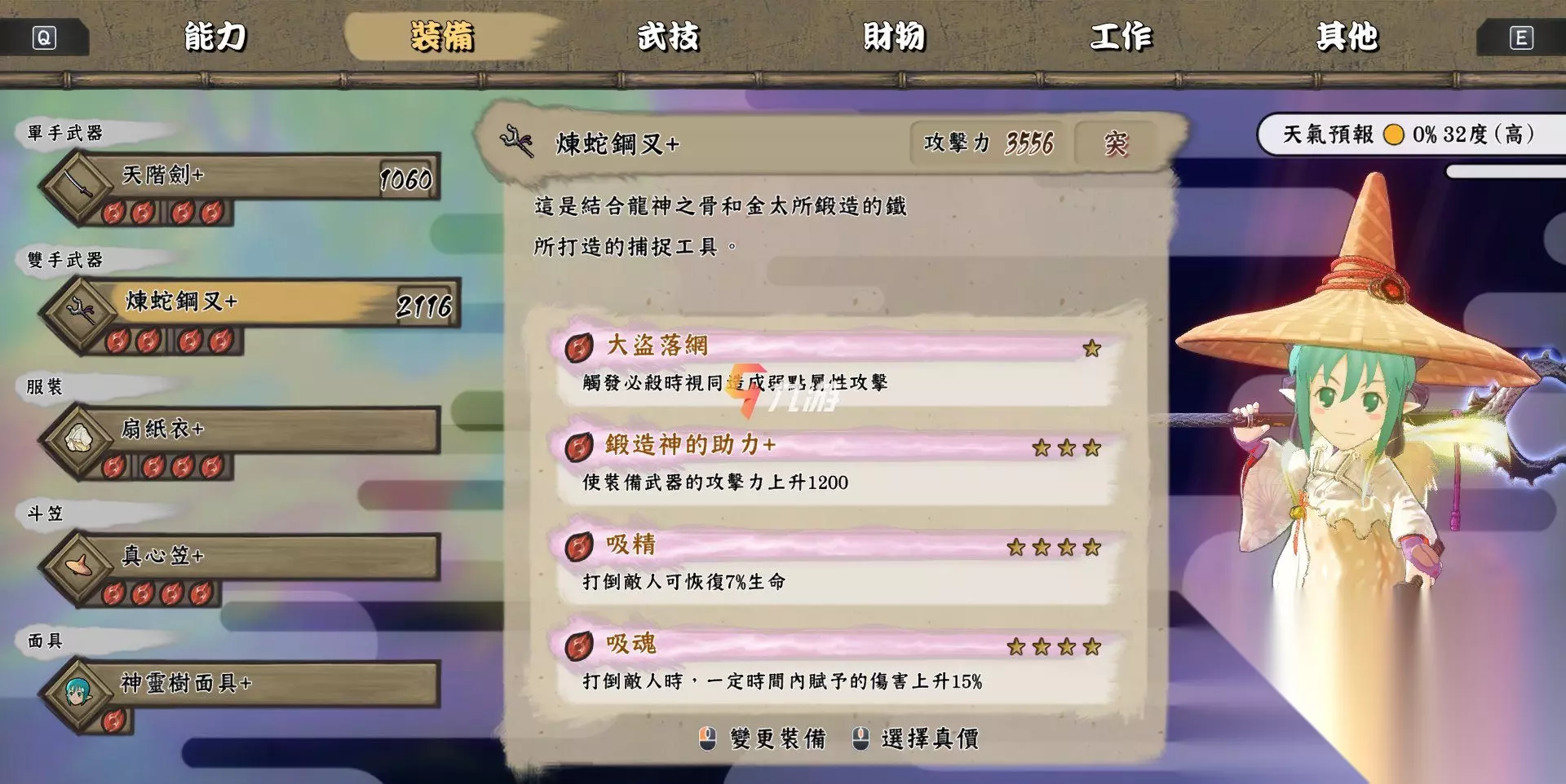 2、炼蛇钢叉+ 【装备效果】触发必杀的话也可以一同造成弱点属性攻击;击倒敌人的话则恢复7%的生命,同时在一定时间内可以提升15%的伤害; 【武器配方】古铁锄头+、铁质锄头+、大业物锄头+、炼蛇钢叉;