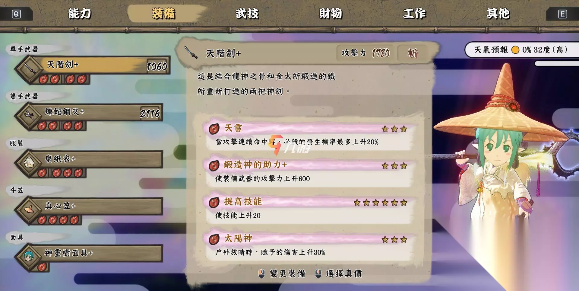 武器装备 1、天阶剑+ 【装备效果】如果连续攻击命中的话,其必杀几率提升20%;如果在户外晴天的时候,起伤害则可以提升30%;而且可以让技能提升20; 【武器配方】古铁镰刀+、铁质镰刀+、大业物镰刀+、天阶剑;