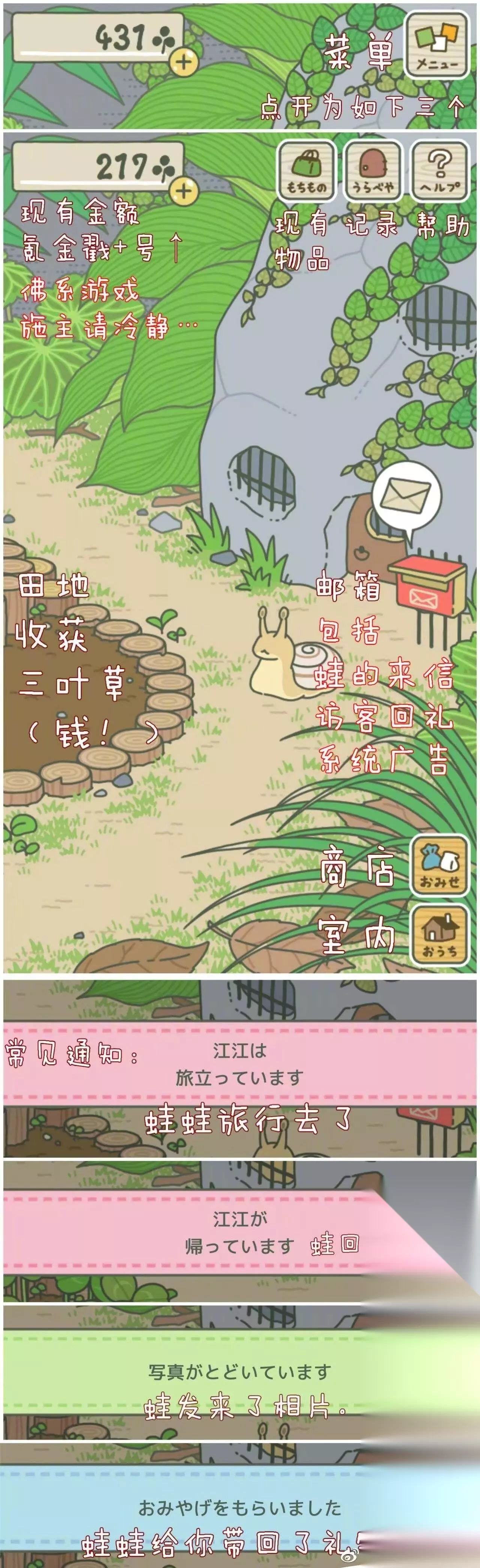 这是一篇《旅行青蛙》的入门攻略,包含游戏界面的中文翻译,还介绍了三叶草货币、物品分类、相册使用、招待客人、行李准备、商店购物以及抽奖等游戏玩法,帮助玩家快速上手游戏。