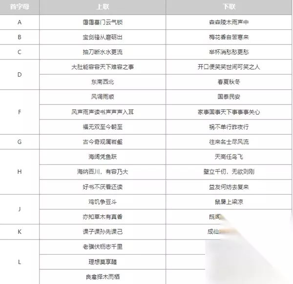 【大侠立志传攻略大全】 大侠立志传太学馆院长对联答案 1、答案:ABCDEFGHIK 霭霭墓门云气锁,森森陵木雨声中。 白古娇兵多致败,从来轻敌少成功。 宝剑锋从磨砺出,梅花香自苦寒来。 抽刀断水水更流,举杯消愁愁更愁。 大肚能容容天下难容之事,开口便笑笑世间可笑之人。 东南西北,春夏秋冬。 风声雨声读书声声声入耳,家事国事天下事事事关心。 风调雨顺,国泰民安。 福无双至今朝至,祸不单行昨夜行。 古今奇观属岩壑,往来名士尽风流。 海阔凭鱼跃,天高任乌飞。 海纳百川有容乃大,壁立千仞无欲则刚。 行止无愧天地,褒贬自有春秋。 好书不厌看还读,益友何妨去复来。 鸡饥争豆斗,鼠暑上梁凉。 既国山右无假色,亦知草木有真香。 课子课孙先课己,成仙成佛且成人。