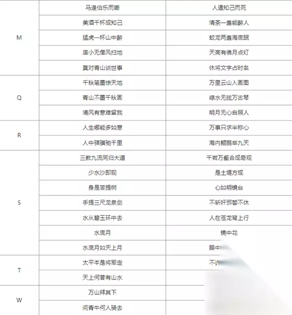 2、LMNOPOR 老骥伏扔志千里,短锥处囊半寸锋。 理想莫享醒,前途弗图钱。 良禽择木而栖,贤臣择主而事。 马逢伯乐而嘶,人遇知己而死。 美酒千杯成知己,清茶一盏能醉人。 一门父子三杯士,两世文章百代春。 猛虎一杯山中醉,蛟龙两盏海底眠。 庙小无僧风扫地,天高有佛月点灯。 莫对青山谈世事,休将文字占时名。 千秋笔墨惊天地,万里云山入画图。 青山无墨千年画,绿水无弦万古琴。 清风有意难留我,明月无心自照人。 人生哪能多如意,万事只求半称心。 人中骐骥驰千里,海内鳃鹏举九天。
