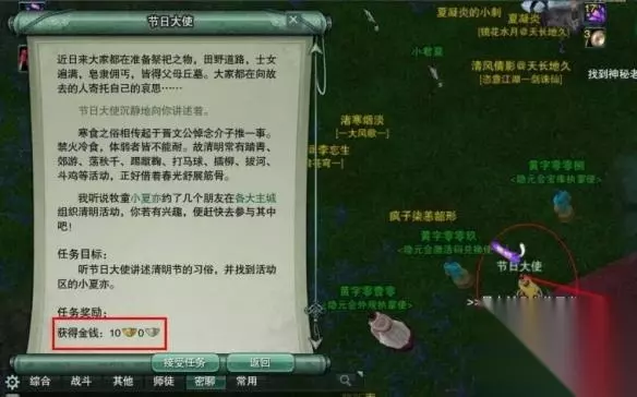 2、找到后和节日大师对话,即可领取清明时节雨纷纷任务