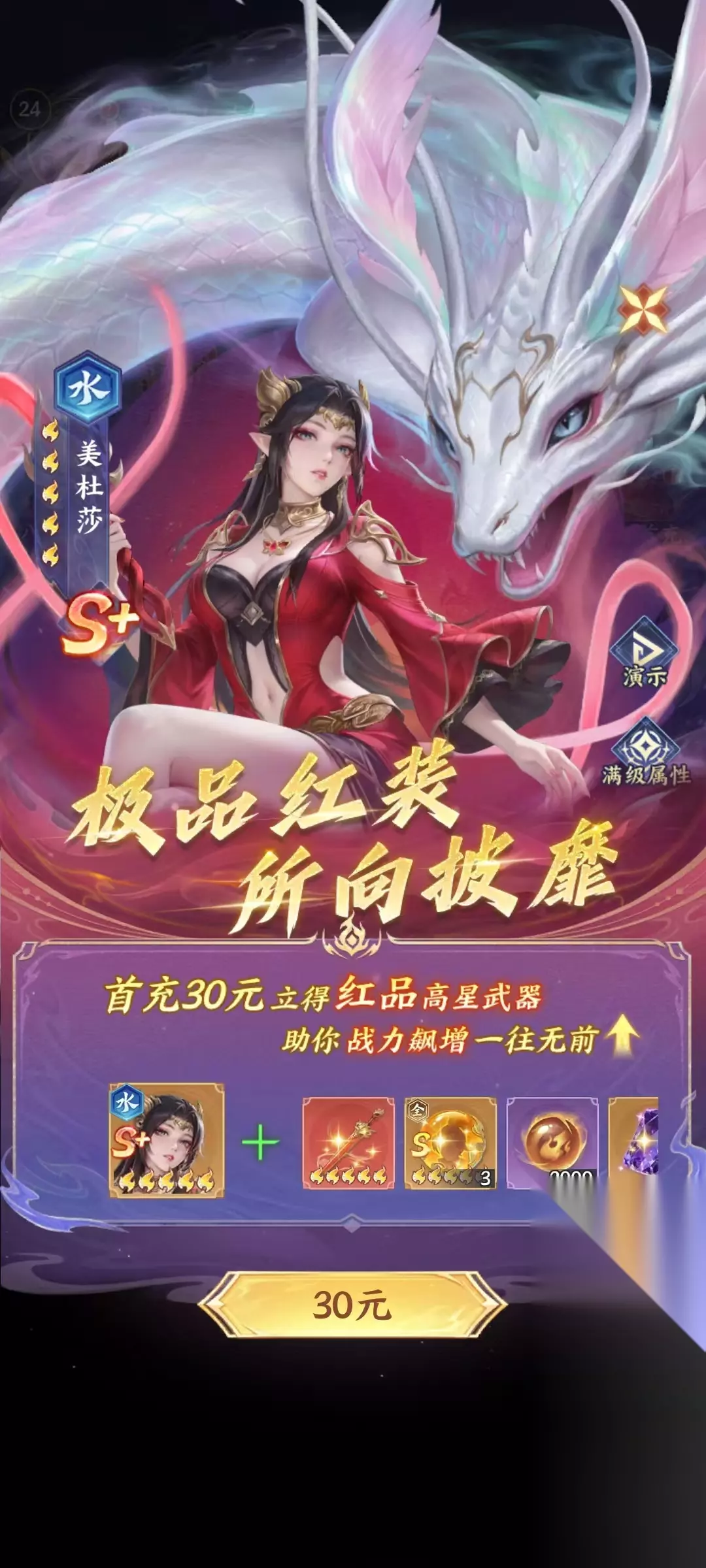 36米开局: 6米首充开局直接拿下核心S+输出斗者美杜莎,再冲30元提升美杜莎星级并获取红品装备,配合千抽的S+斗者推关爬塔没压力! 而且这36米的金额还能同时触发小月卡,性价比直接拉满!
