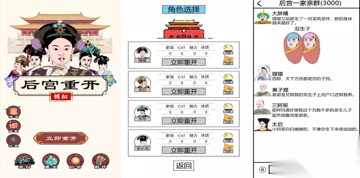 后宫妖妃传是款能让大家用第一视角进入后宫进行互动的游戏,很全面的剧情塑造给人真实穿越后宫的既视感,宫斗剧的故事展现和高颜值妃子角色交相呼应,完善的互动性也容易让玩家在后宫中自由冒险,游戏角色塑造生动且人设也十分完美,平时喜欢看宫斗剧的朋友不妨下载后宫妖妃传试一下。 手机扫码下载233乐园APP预约 预约订阅最新动态 优先233乐园APP下载 3、《后宫重开模拟》