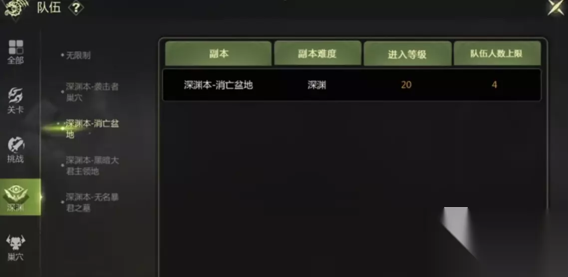 2、深渊介绍 然后游戏目前的话一共有4个深渊,最低等级的深渊也要15级才能开启,也就是袭击者巢穴。另外还有消亡盆地,想打的话等级也会提升,要20级才能进入。还有黑暗大君主领地,这个本就要28级才能进入。最后无名暴君之墓要35级才可以进入,总之除了等级外,大家的装备也要好才有机会通过。