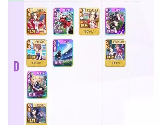 5.支援卡强度榜D级如下:帝王光辉、黄金船、目白赖恩、神宫、成田大进、米浴、黄金城、荣进闪耀