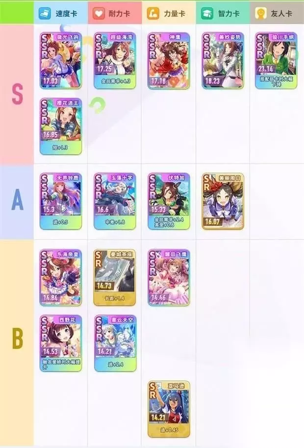 6.本节奏榜只量化每张卡的绝对数值配卡方式不同强度会变化。 7.支援卡数据为全满破数据,评级低的卡不代表是弱卡,相反可能是平民手中的强卡。 以上这些就是闪耀优俊少女国服最强的支援卡排行榜了,玩家们如果可以选择到s级的支援卡,那么绝对可以作为你的主力,相信你在看完了这篇文章之后,就能够知道自己最需要的支援卡是哪一个了。