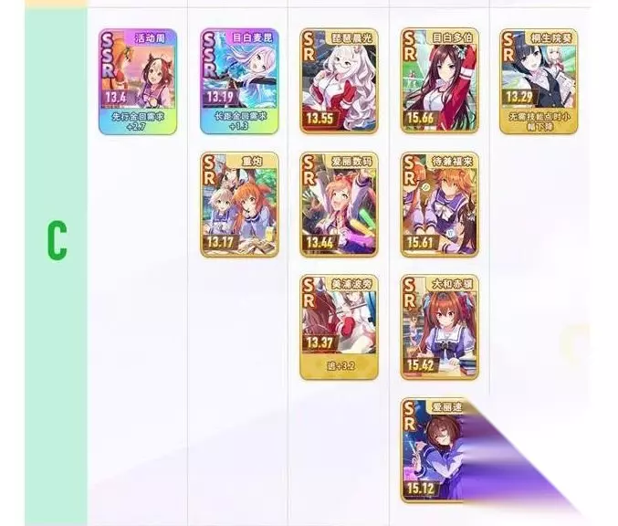 4.支援卡强度榜C级如下:活动周、目白麦昆、琵琶晨光、目白多伯、桐生院葵、重炮、爱丽数码、待兼福来、大和赤骥、美浦泼旁