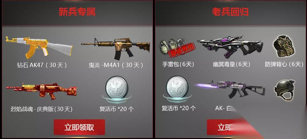 二、新兵老兵礼 1、活动期间,新注册逆战的玩家可直接领取新兵专属礼包一份; 2、5月5日前注册且5月25日后未登录的老兵可领取回归礼包; 3、礼包直接发送至游戏内仓库。