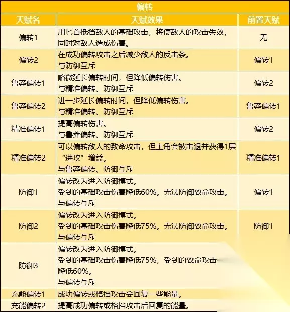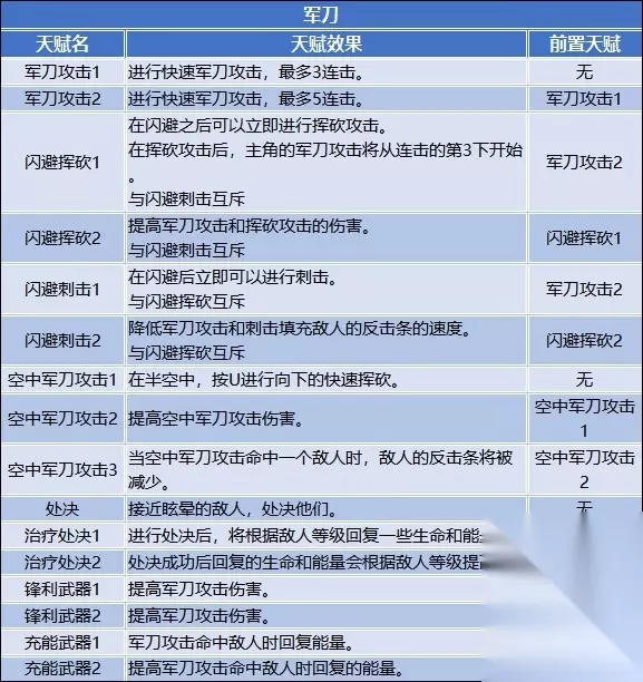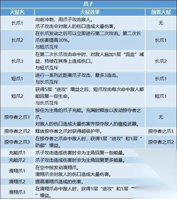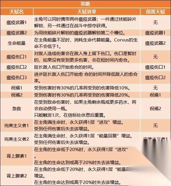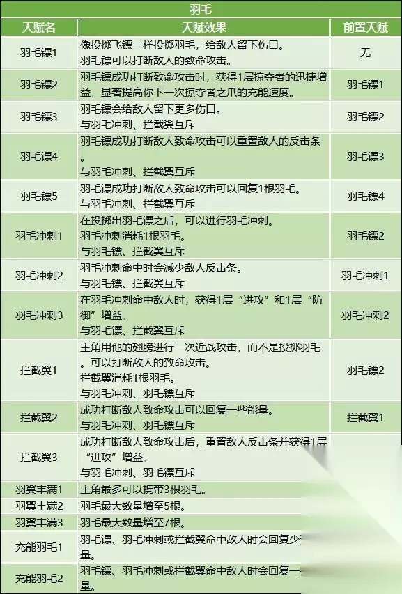 天赋推荐 天赋习得方法 在【信标菜单】选择【天赋菜单】,使用天赋点数学习新的天赋。 天赋可以随时遗忘,所以尝试不同的游戏风格,为未来的各种挑战做准备。 前期天赋推荐 跑图:治疗处决1>短促闪避2=掠夺者之爪2>锋利武器1=锋利武器2>治疗处决2大=羽翼丰满/生长羽毛 BOSS战:闪避挥砍1=短促闪避2=掠夺者之爪2>锋利武器1=锋利武器2=瘟疫伤口2 军刀