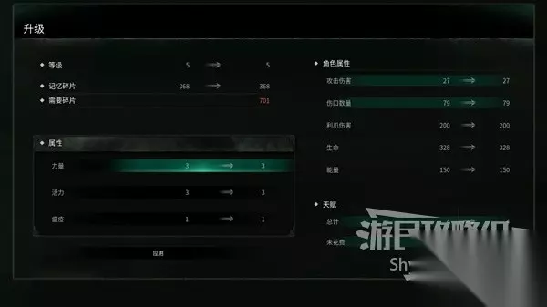 角色属性及升级加成效果 升级方法 在【信标菜单】选择【升级】,然后使用记忆碎片来强化属性。 属性说明 每增加1点属性就能获得1点天赋点数,最高可达25级。 力量-提高军刀攻击和伤口伤害; 活力-提高最大生命; 瘟疫-提高爪子伤害和最大能量。