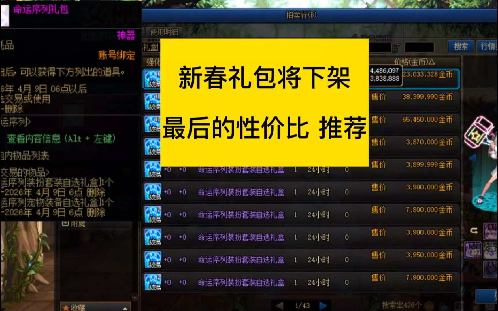 距离地下城与勇士新春产物下架还剩9天,当前新春产物价格大跳水,推荐别错过包括售价26万的往昔之抉择宝珠自选礼盒、680万的梦想白金徽章礼盒等在内的六款高性价比道具,还有能提升全角色150名望100三攻的命运序列礼包。