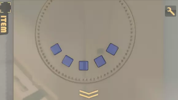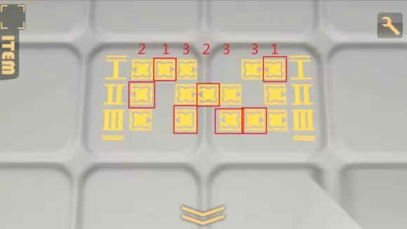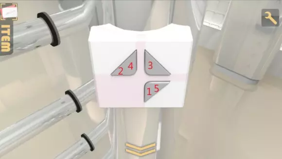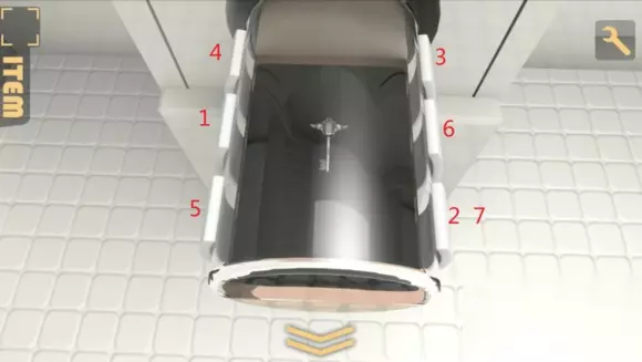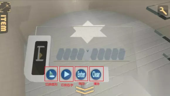回到第一个机关,拧钥匙切到控制墙的那一格,按下按钮,发现所有墙都升起来了,上面出现数字,左边是5,1,4,右边是3,6,7 2,这个就是开启玻璃柜的方式,按照对应的位置,按顺序按下机关