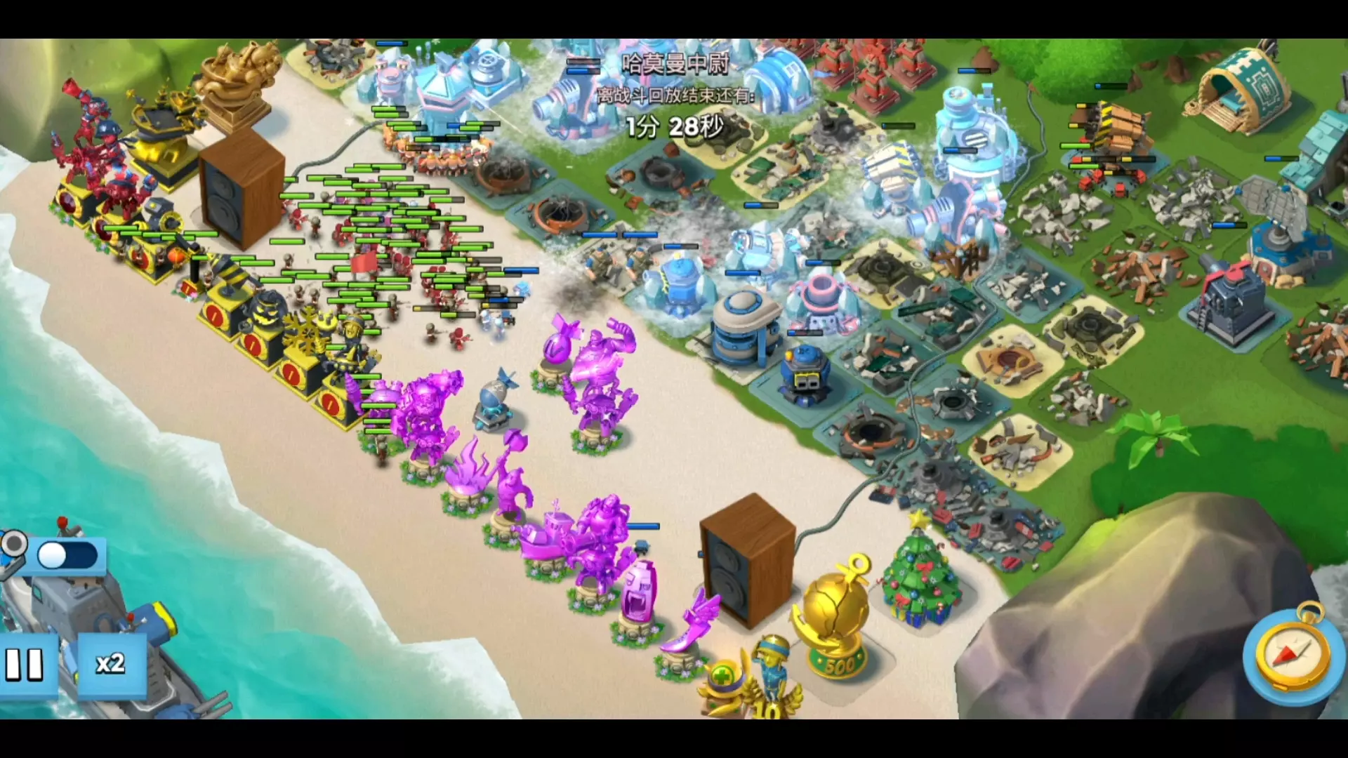 这是策略游戏《海岛奇兵》的哈莫曼的反击玩法内容,本次哈莫曼的部队全是机甲,战斗难度较高,展示了玩家布置防御装置抵御机甲部队进攻的战斗过程,完成阶段挑战可获取对应奖励。