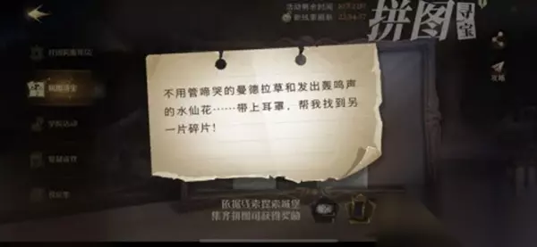 根据线索里面的水仙花和草小编大概知道任务拼图的位置了,还不清楚任务完成方法的玩家和小编一起来看看不用管啼哭的曼德拉草和发出轰鸣声的水仙花拼图寻宝攻略吧。