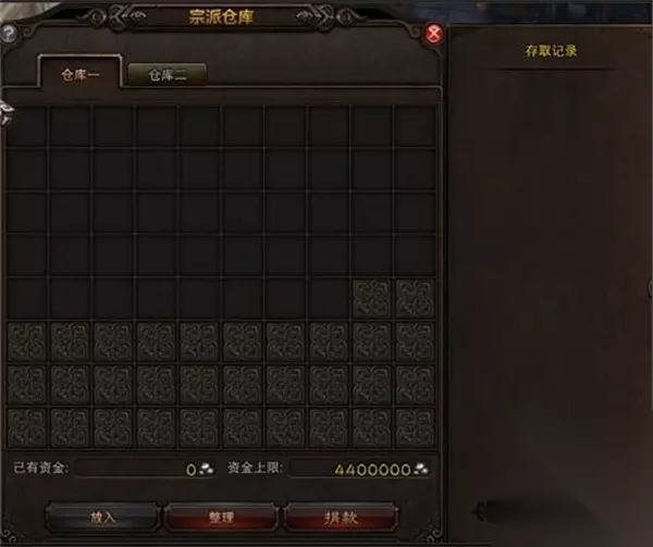 4、宗派仓库。 所有宗派成员都可以通过钱多多(宗派驻地【90,40】)自由存入物品,具有特定权限的成员可从宗派仓库中取出物品,交易绑定的物品一旦存入宗派仓库,取出时将被绑定。提升仓库建筑等级,将增加宗派仓库的存储位。